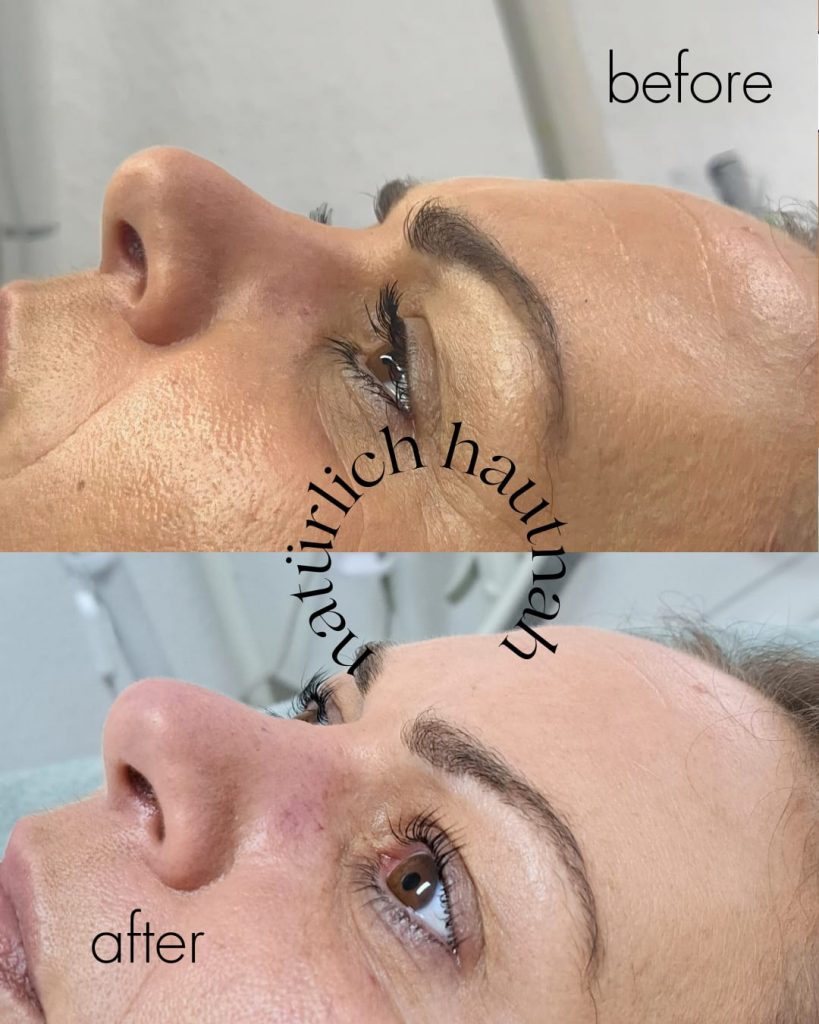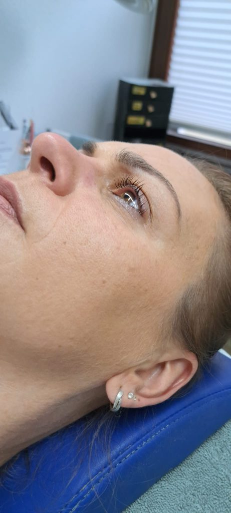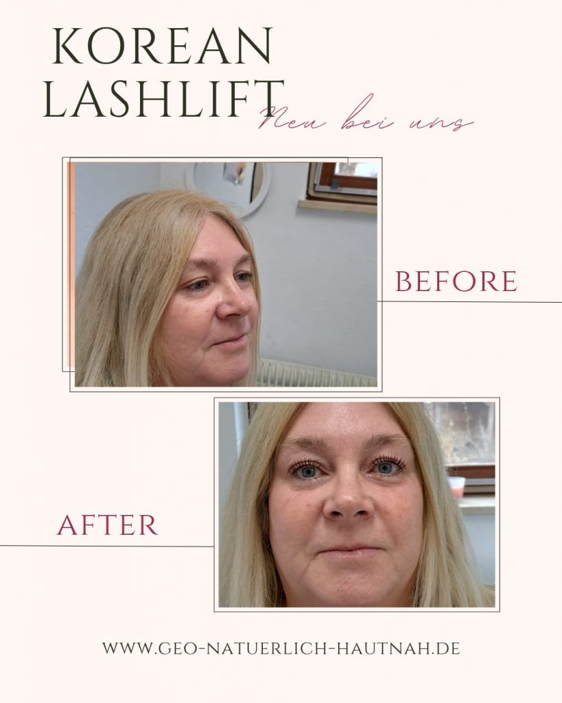 gerade wird die Natur Wimper hoch geliftet, unten das schöne ErgebnisErgebnis ,Wimpernlifting neuer schwung in der Naturwimper, hält 6bis 8 Wochen